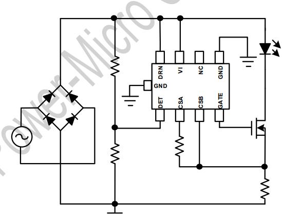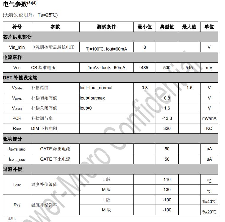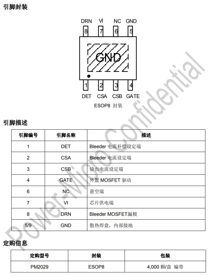 PM2029是一款大功率可控硅調(diào)光線性驅(qū)動芯片, 電源系統(tǒng)結(jié)構(gòu)簡單,只需很少的外圍元件就可以 實現(xiàn)非常優(yōu)秀的恒流特性。在實現(xiàn)精簡的外圍電 路、較小的驅(qū)動器體積的同時,大大降低了系統(tǒng) 成本。 PM2029內(nèi)部集成了兩個固定恒流源,一路控制 BLEEDER電流,一路驅(qū)動外置MOS,可滿足大 功率可控硅調(diào)光的照明應用。 PM2029采用了500V的高壓半導體制造工藝以 確保市電瞬變時的可靠性;內(nèi)部集成了過溫度補 償電路以避免驅(qū)動器的熱失效。PM2029還集成 了各種保護功能,包括輸出開路、CS開路保護。 從而提高了LED恒流電源的可靠性。