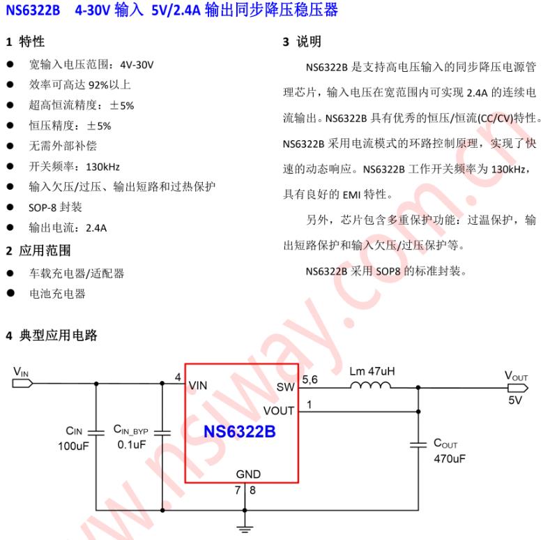 NS6322B是支持高電壓輸入的同步降壓電源管 理芯片,輸入電壓在寬范圍內(nèi)可實現(xiàn)2.4A的連續(xù)電流輸出。NS6322B具有優(yōu)秀的恒壓/恒流(CC/CV)特性。