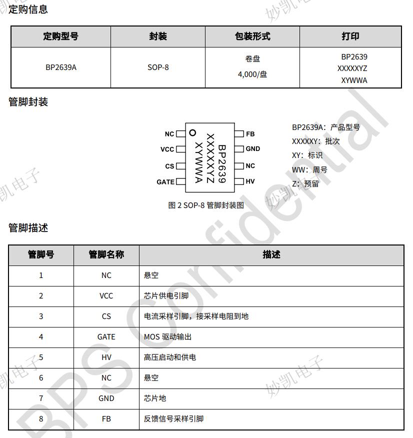 BP2639A具有多重保護(hù)功能,包括輸出過壓保護(hù)(OVP)、MOS過流保護(hù)、芯片溫度過熱保護(hù)等。BP2639A采用SOP-8封裝。