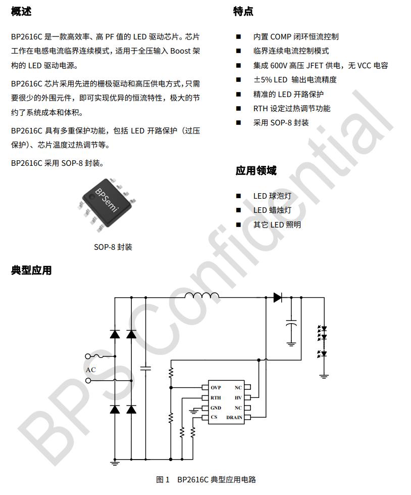 內(nèi)置COMP閉環(huán)恒流控制臨界連續(xù)電流控制模式集成600V高壓JFET供電,無VCC電容土5%LED輸出電流精度精準的LED開路保護RTH設(shè)定過熱調(diào)節(jié)功能采用SOP-8封裝