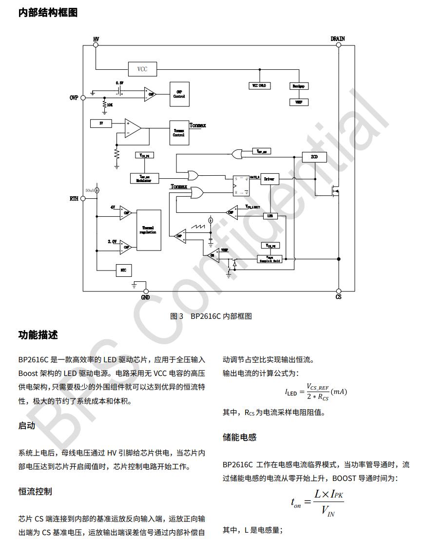BP2616是一款高效率、高PF值的LED驅(qū)動芯片。芯片工作在電感電流臨界連續(xù)模式,適用于全壓輸入Boost架構(gòu)的LED驅(qū)動電源。BP2616芯片采用先進的柵極驅(qū)動和高壓供電方式,只需要很少的外圍元件,即可實現(xiàn)優(yōu)異的恒流特性,極大的節(jié)約了系統(tǒng)成本和體積。BP2616具有多重保護功能,包括LED開路保護(過壓保護)、芯片溫度過熱調(diào)節(jié)等。BP2616采用SOP-8封裝。