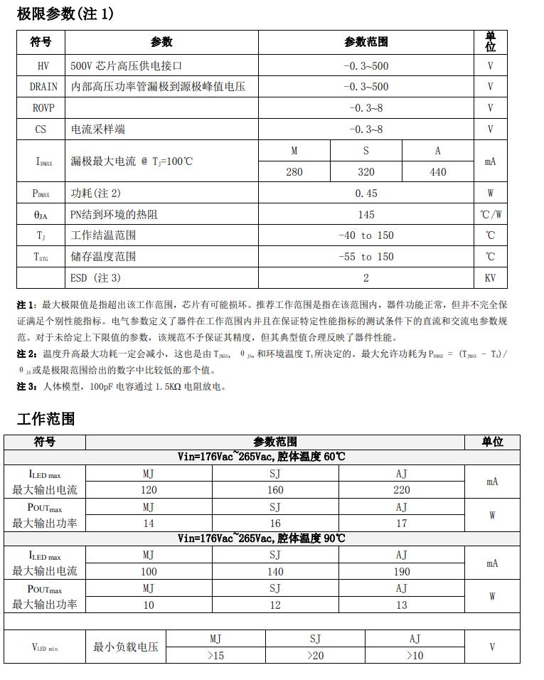| 產品型號 | 封裝 | MOS內阻 | MOS耐壓 | 過溫 保護 | 開路保護 | 輸出電流@Vout=72V(mA) (Vin=176V-265V) | 最大輸出功率(W) (Vin=176V-265V) |