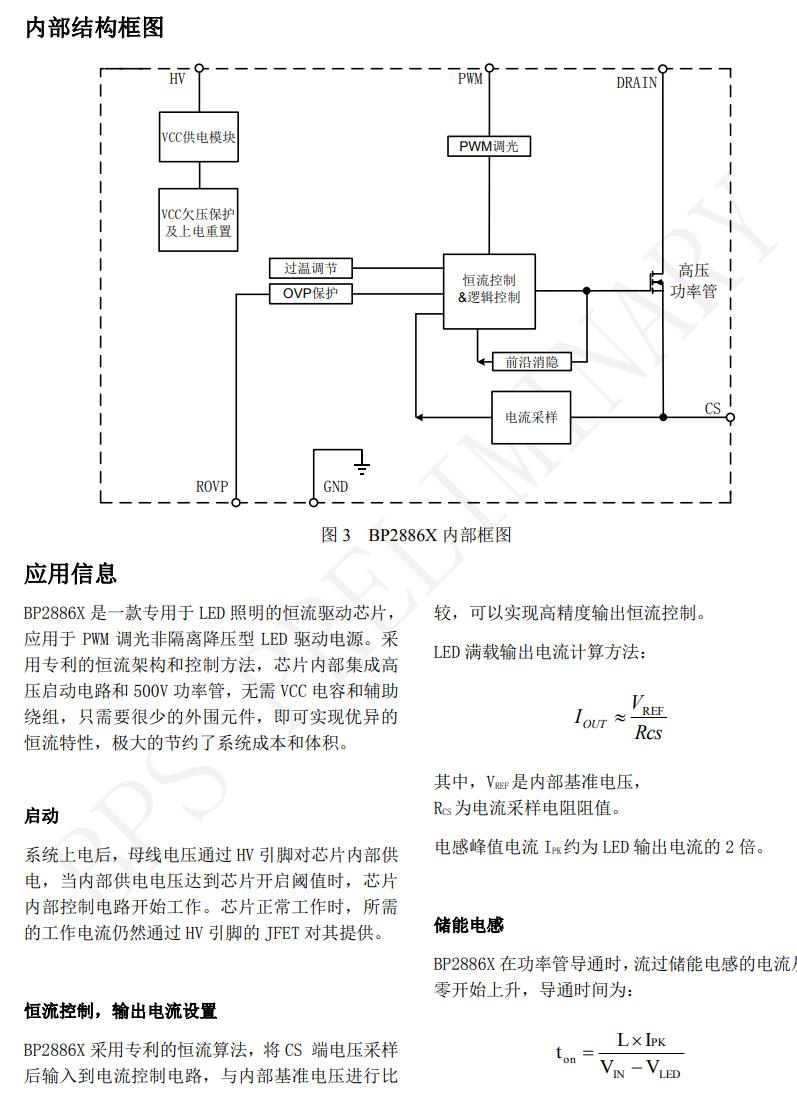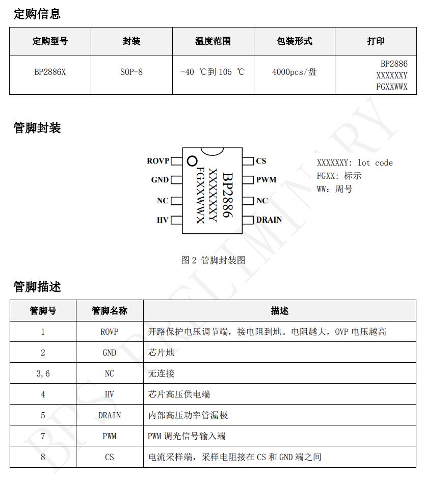BP2886X 具有多重保護功能,包括 LED 開路保護, LED 短路保護,芯片溫度過熱調節等。 BP2886X 采用 SOP-8 封裝。