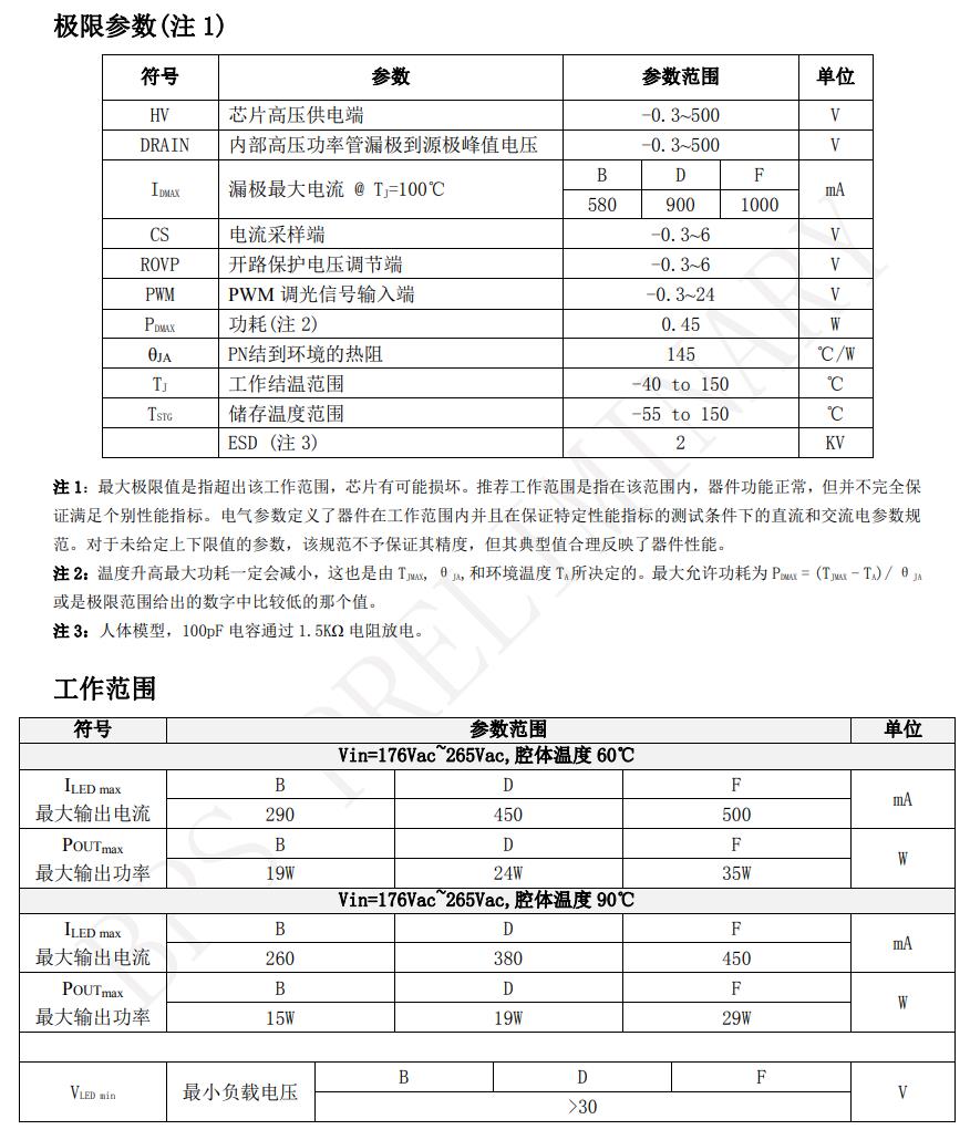 優勢 支持 1%-100%PWM 調光 全程模擬調光無頻閃 無需啟動電阻和 VCC 電容 內部集成 500V 功率管 ±5% LED 輸出電流精度 LED 開路保護 LED 短路保護 過熱調節功能 采用 SOP-8 封裝