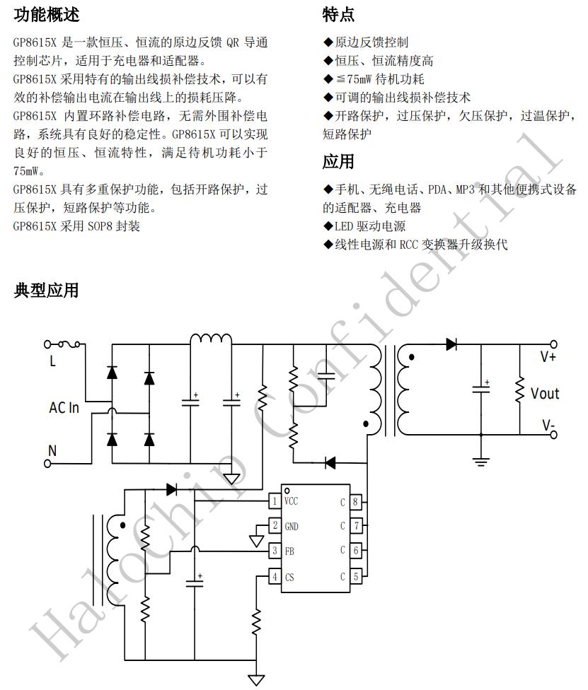 GP8615X是一款恒壓、恒流的原邊反饋QR導(dǎo)通控制芯片,適用于充電器和適配器。GP8615X采用特有的輸出線損補償技術(shù),可以有效的補償輸出電流在輸出線上的損耗壓降。