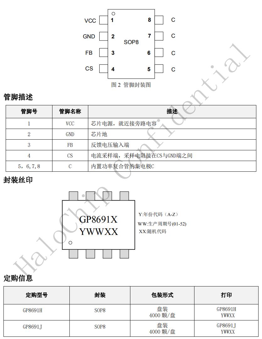 GP8691X可以實(shí)現(xiàn)良好的恒壓、恒流特性,滿足待機(jī)功耗小于75mW。GP8691X具有多重保護(hù)功能,包括開路保護(hù),過(guò)壓保護(hù),短路保護(hù)等功能。GP8691X采用SOP8封裝