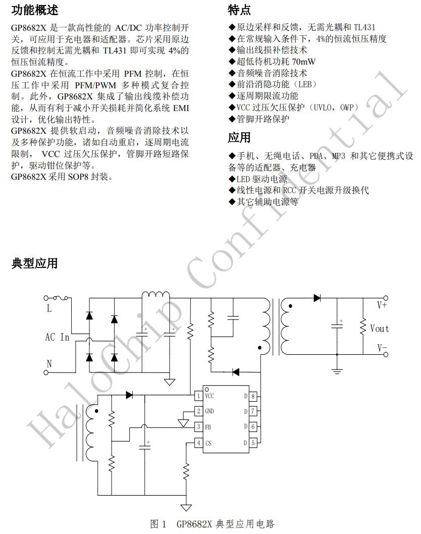 GP8682X是一款高性能的AC/DC功率控制開關,可應用于充電器和適配器。芯片采用原邊反饋和控制無需光耦和TL431即可實現4%的恒壓恒流精度。