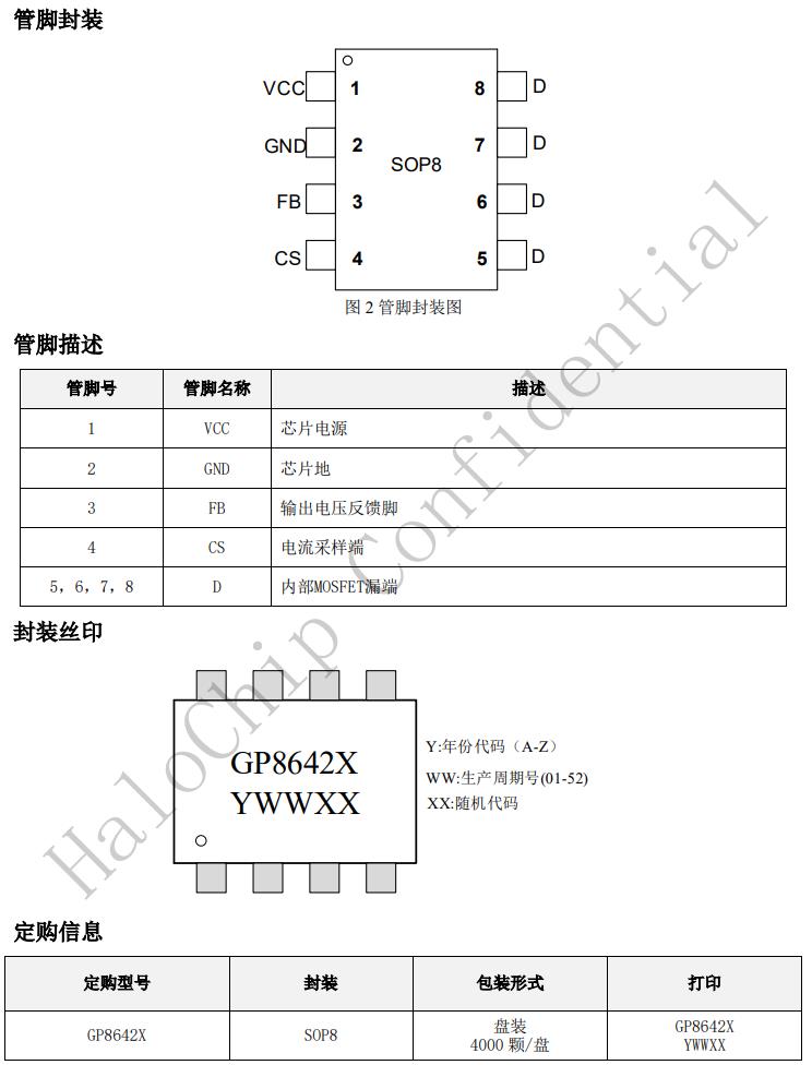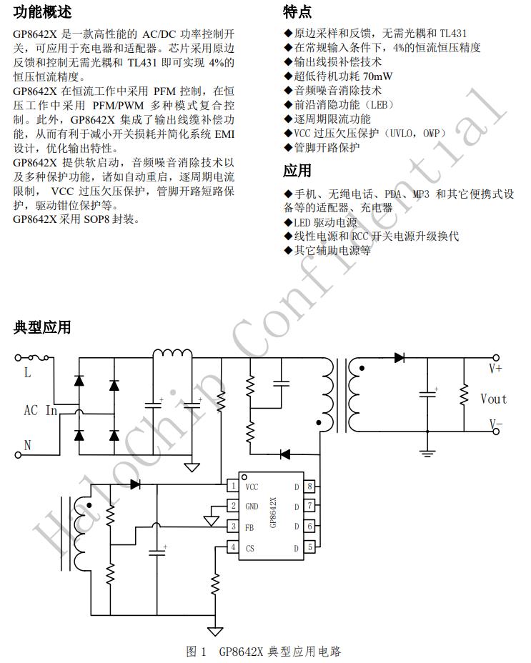 GP8642X是一款高性能的AC/DC功率控制開關(guān),可應(yīng)用于充電器和適配器。芯片采用原邊反饋和控制無需光耦和TL431即可實(shí)現(xiàn)4%的恒壓恒流精度。