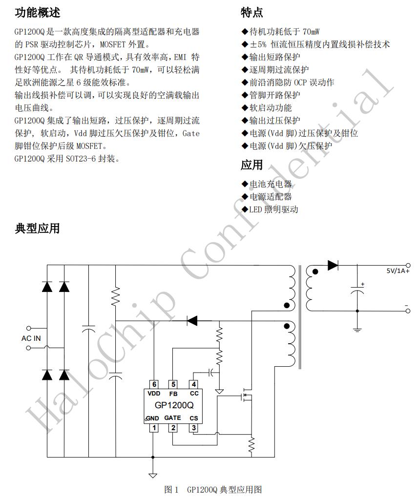 GP1200Q是一款高度集成的隔離型適配器和充電器的PSR驅(qū)動(dòng)控制芯片,MOSFET外置。GP1200Q工作在QR導(dǎo)通模式,具有效率高,EMI特性好等優(yōu)點(diǎn)。其待機(jī)功耗低于70mW,可以輕松滿足歐洲能源之星6級(jí)能效標(biāo)準(zhǔn)。輸出線損補(bǔ)償可以調(diào),可以實(shí)現(xiàn)良好的空滿載輸出電壓曲線。