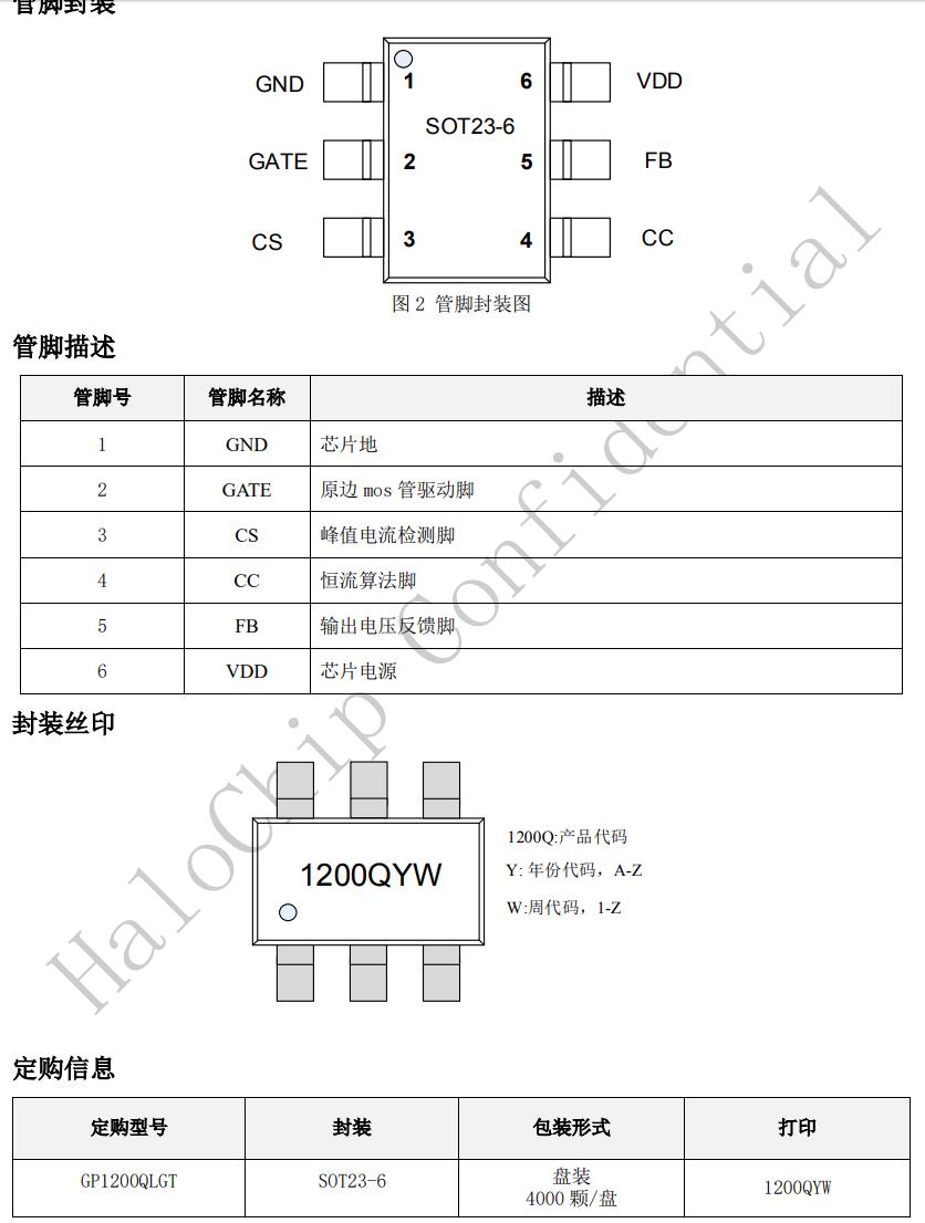 GP1200Q集成了輸出短路,過(guò)壓保護(hù),逐周期過(guò)流保護(hù),軟啟動(dòng),Vdd腳過(guò)壓欠壓保護(hù)及鉗位,Gate腳鉗位保護(hù)后級(jí)MOSFET。GP1200Q采用SOT23-6封裝。