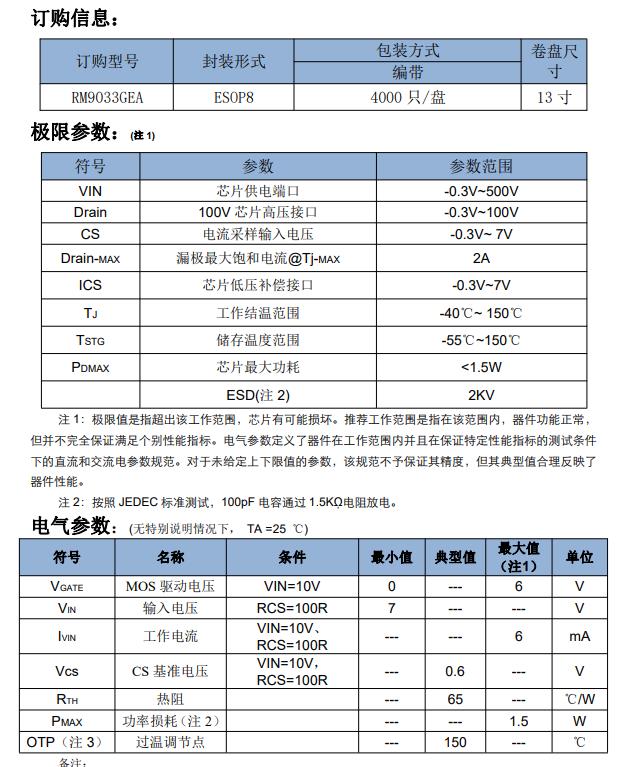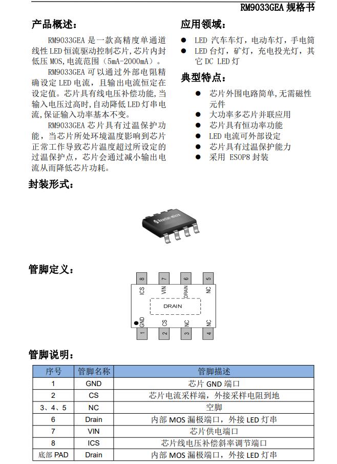 RM9033GEA 是一款高精度單通道 線性 LED 恒流驅動控制芯片,芯片內封 低壓 MOS,電流范圍(5mA-2000mA)。 RM9033GEA 可以通過外部電阻精 確設定 LED 電流,且輸出電流恒定在 設定值。芯片具有線電壓補償功能,當 輸入電壓過高時,自動降低 LED 燈串電 流,保證輸入功率基本不變。 RM9033GEA 芯片具有過溫保護功 能,當芯片所處環境溫度影響到芯片 正常工作導致芯片溫度超過所設定的 過溫保護點,芯片會通過減小輸出電 流從而降低芯片功耗。